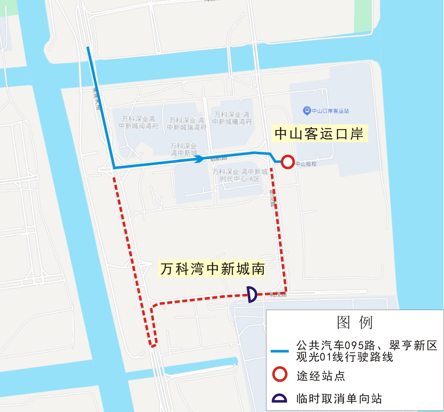 关于公共汽车095路及翠亨新区观光01线往中山客运口岸方向临时取消“万科湾中新城南”站的通告